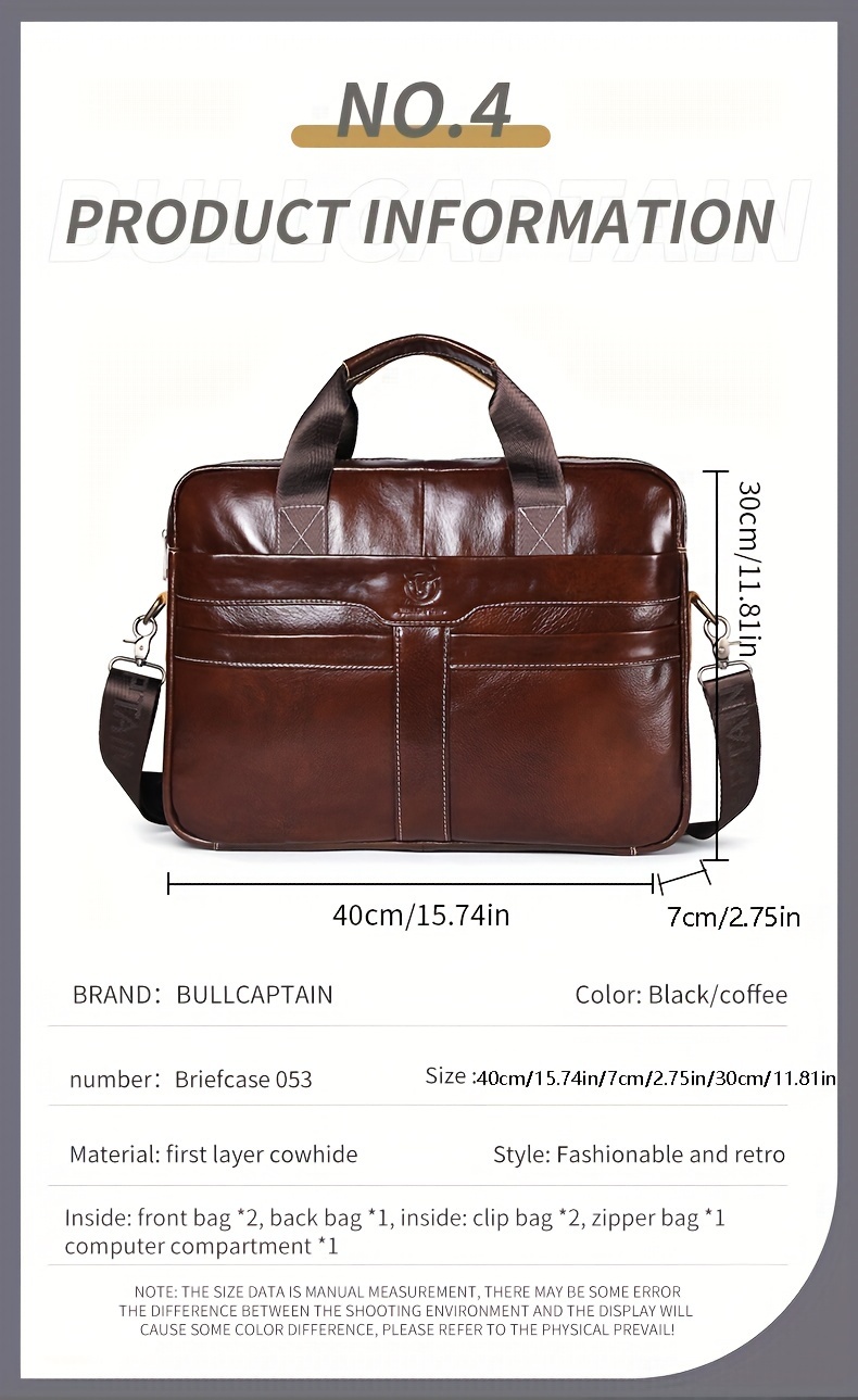 1pc BULLCAPTAIN Genuine Leather Briefcase for Men, Casual Style with Embossed Detail, Removable Adjustable Strap, Laptop & Device Compartments, Lightweight Business Messenger Bag with Zip Closure, Polyester Lined, for Office,