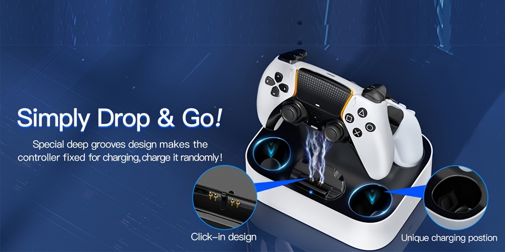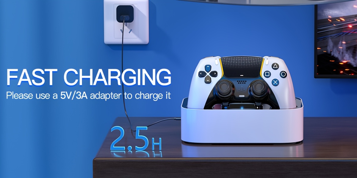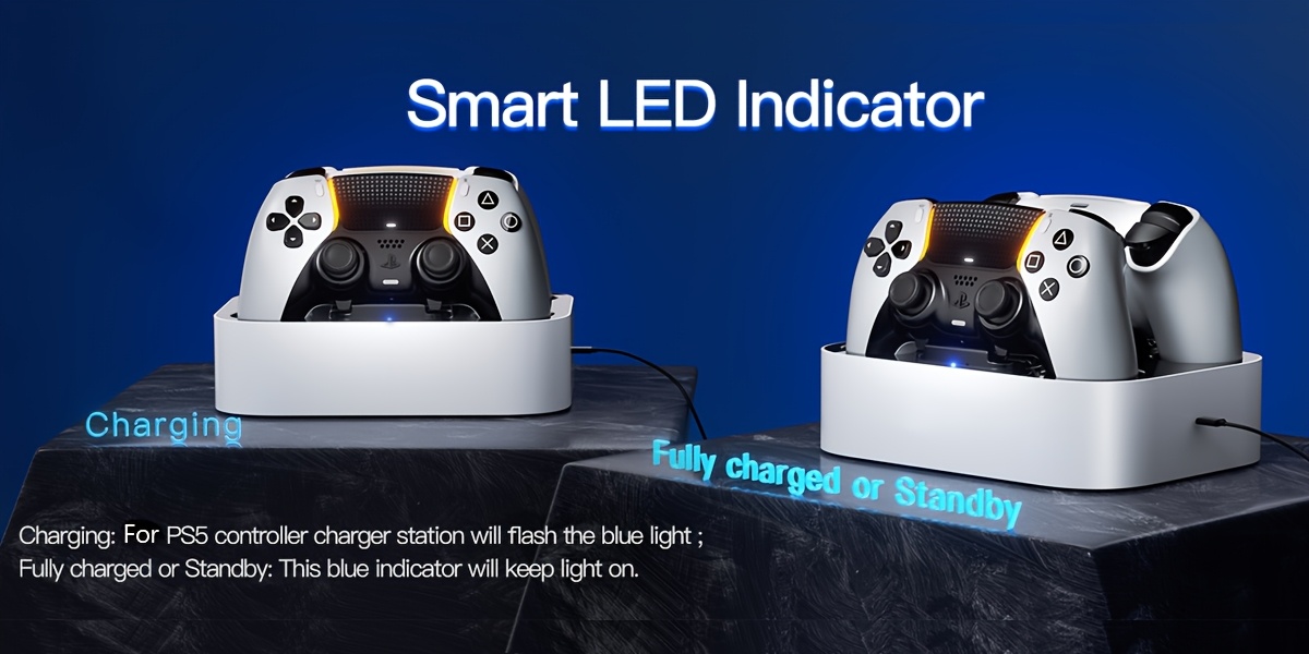 This charging dock for PS5 controllers allows you to charge two controllers at the same time. It takes 2.5 hours to fully charge a controller, helping you save time for more gaming enjoyment. (Note: Use a 5V/3A adapter for charging) [LED light and anti-slip features] The LED indicator blinks blue while charging, and stays lit when the controller is fully charged or in standby mode. The charger is equipped with four anti-slip pads.
