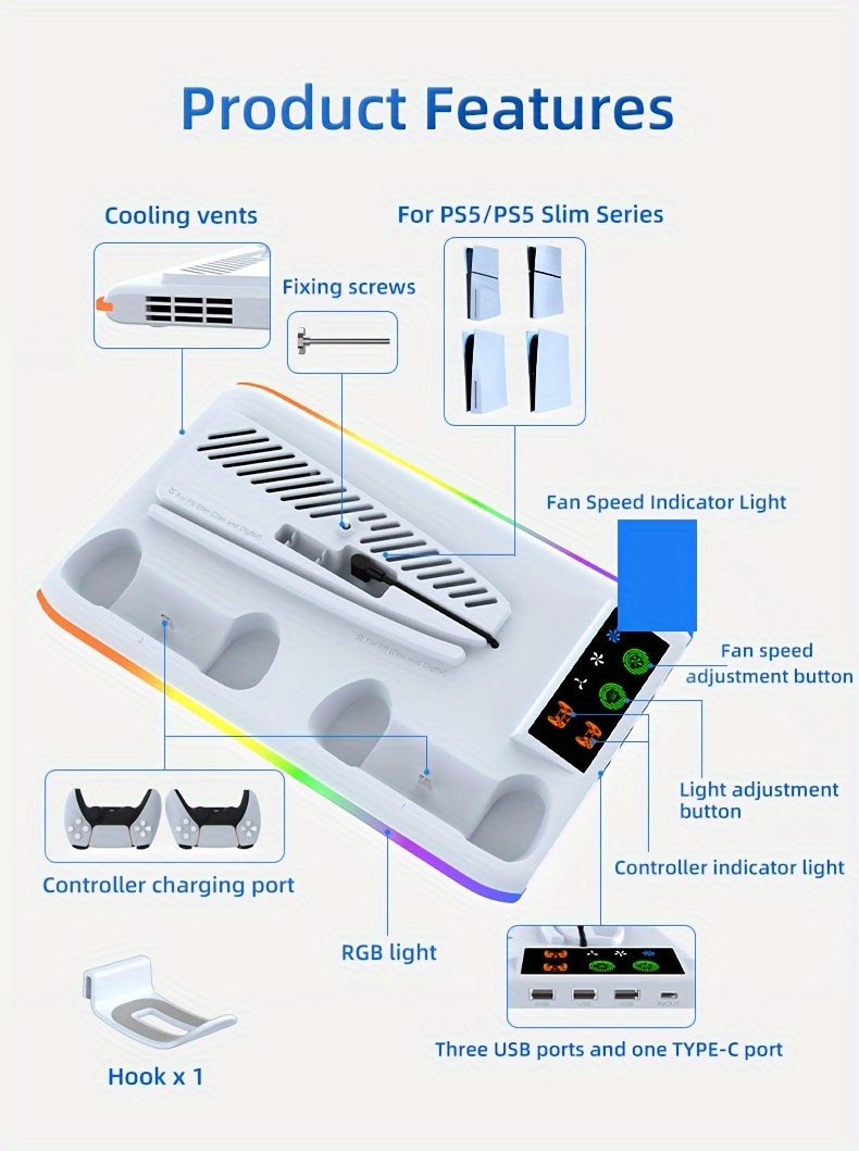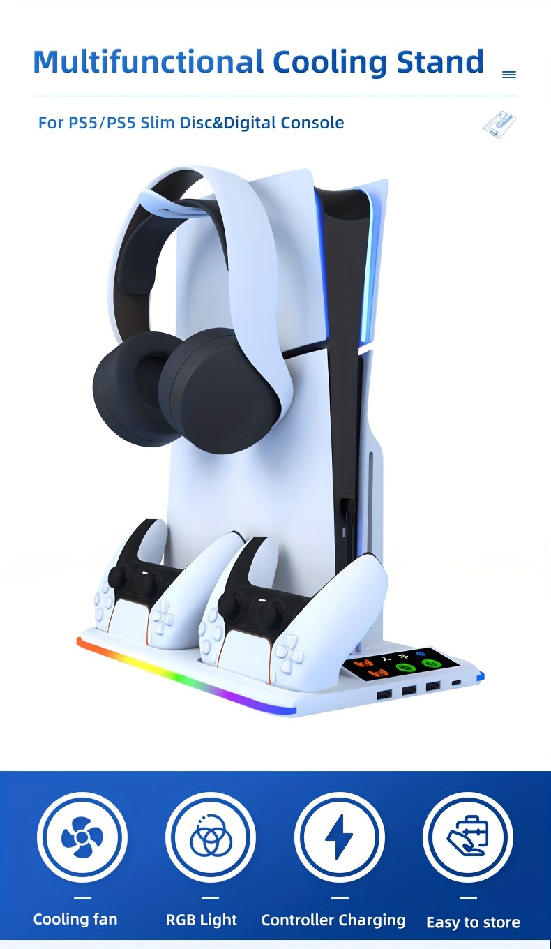 PS5/PS5 Slim Cooling Stand with RGB LED Controller Charger - 3-Level Fan System, Secure Console & Accessory Holder for PlayStation 5 Digital & Disc Editions